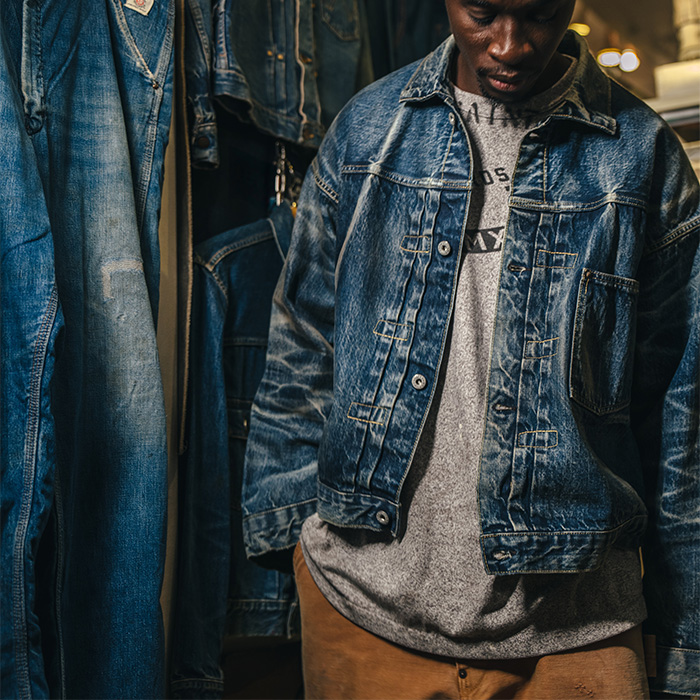 約3年の歳月を経て完成した’50年代の霜降りグレーを踏襲したTシャツと、BerBerJinディレクター藤原裕氏がこれまで見てきたデニムジャケットの中でもトップクラスの色落ちを誇るモデルをサンプリングし、オールハンドによる加工が施されたデニムジャケットが登場。