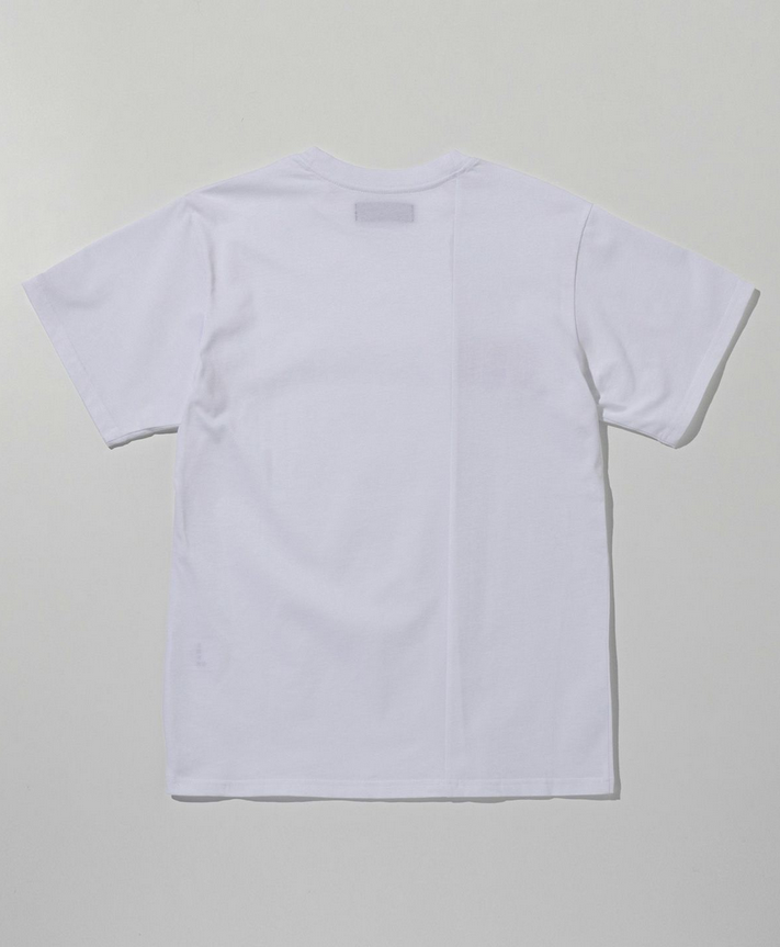 左右で異なる加工のロゴを配置したスウィッチングデザインの半袖カットソー。