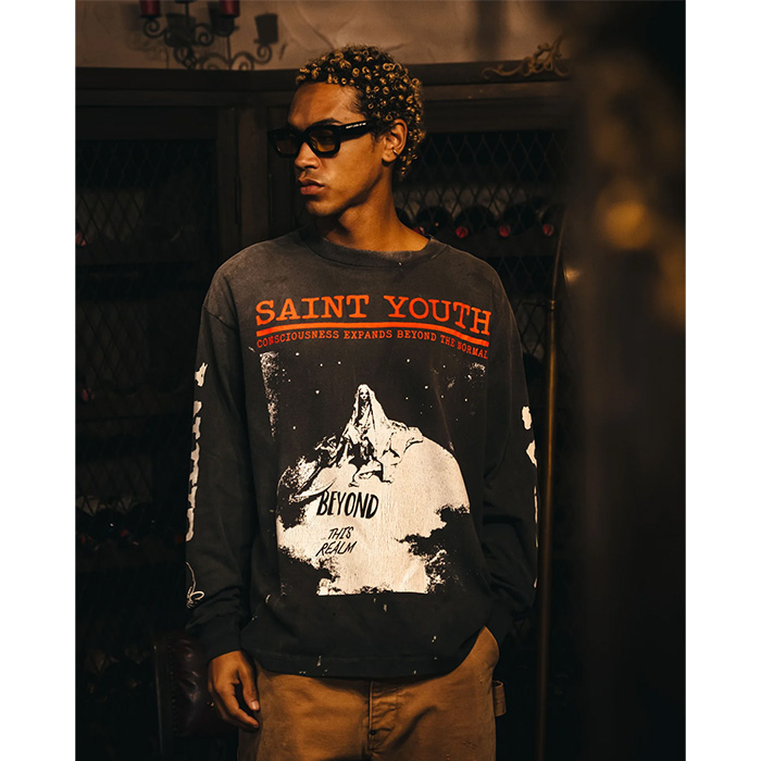 フロントには「SAINT YOUTH」のレタリングプリント、バックにはメッセージプリントが施され、両袖にはブランドロゴとキャラクターがデザインされています。