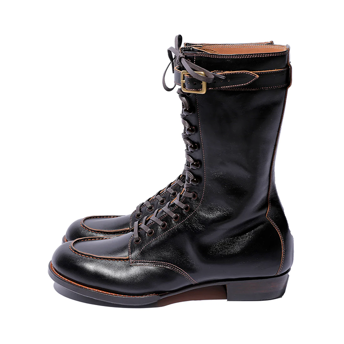 この丈の高い「ブーツ」は、屋外での危険を伴う仕事や、アウトドア活動などで広く履かれていました。Grand Sportif (グラン・スポルティフ) は、そうしたふくらはぎ丈(中底から履き口まで US 8 サイズで 25cm となり、約10 インチ丈)のモカシン型のブーツです。ラスト、丈以外のデザイン、製法、ソールなどは 定番 Sportif と同様ですが、アッパーの革は Sportif とは違って、イタリア産の馬革(ホースフロント)の下地を日本で黒染め加工して茶芯としたものを使っています。