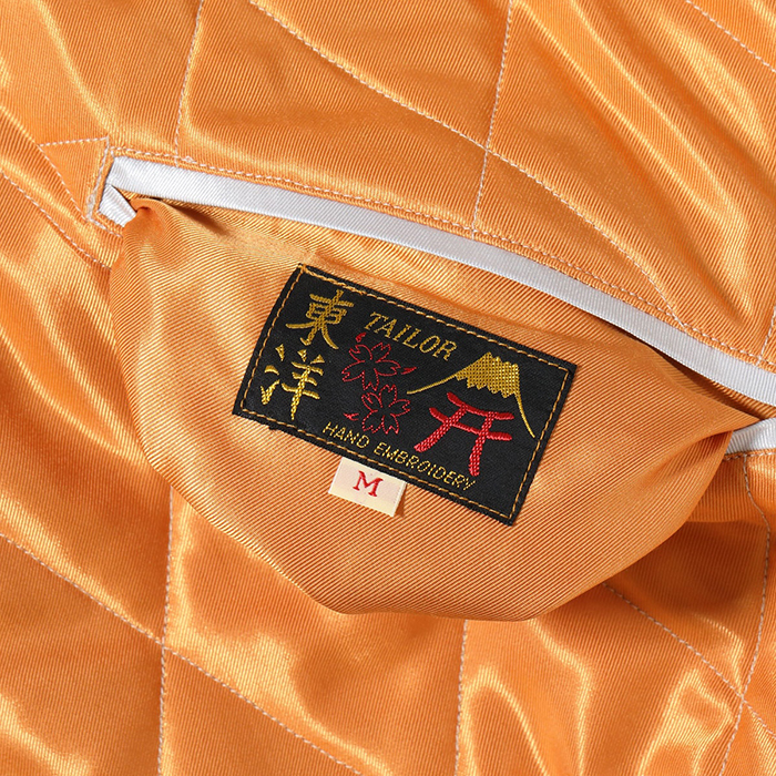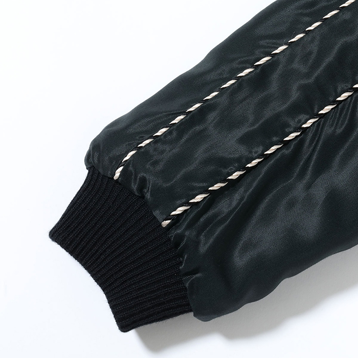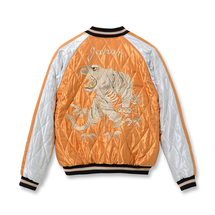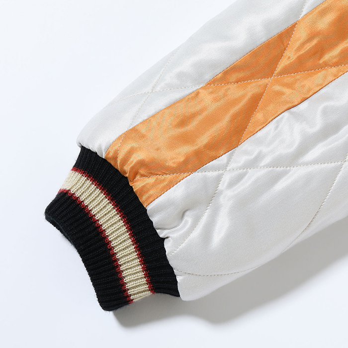 両面にアセテートを使ったスーベニアジャケットには、このような中綿入りでキルティング仕様のタイプも存在する。中綿なしのタイプ同様にスカジャンの歴史の黎明期から作られており、キルティングステッチは片面にしか入っていないためリバーシブルで2種類の表情を楽しめる。