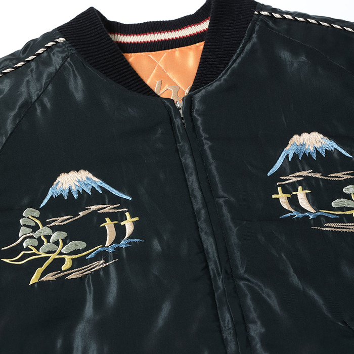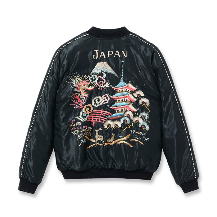 リバーシブル面は、黒一色のボディにブルーやピンクなどカラフルな淡い色糸で日本の風景を描いたランドスケープ柄。モチーフは冬の風景で、胸には富士山と松、背中には龍やオリエンタルな仏塔、松の木の根元に佇む鹿を刺繍。当時の米兵にとって、スカジャンは祖国に持ち帰りたくなる魅力的な風景画でもあった。