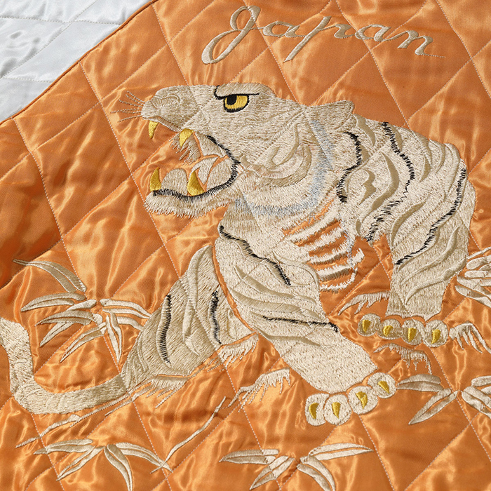 オレンジ×シルバーのボディに白虎が咆哮する1950 年代初期の作品。白を基調とした色糸を使って針足の方向を自在に操り、刺繍の立体感で虎の毛並みや縞模様、岩場に乗り上げた前足の躍動感を表現。胸の虎も通常より大きめで、迫力の刺繍が特徴。赤ラインの入った黒いリブで全体を引き締めている。