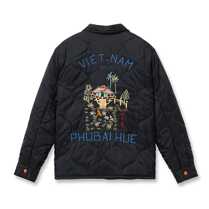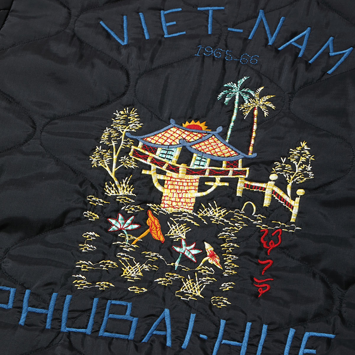戦後の日本で誕生したスカジャン同様、1960年代から1970年代のベトナム戦争時に生まれたスーベニアジャケットが、通称ベトジャン。コットンツイル、もしくはカモフラージュ柄のポンチョライナーの2種類の生地が主に使われ、マットな太めの色糸で絵柄が刺繍されている。