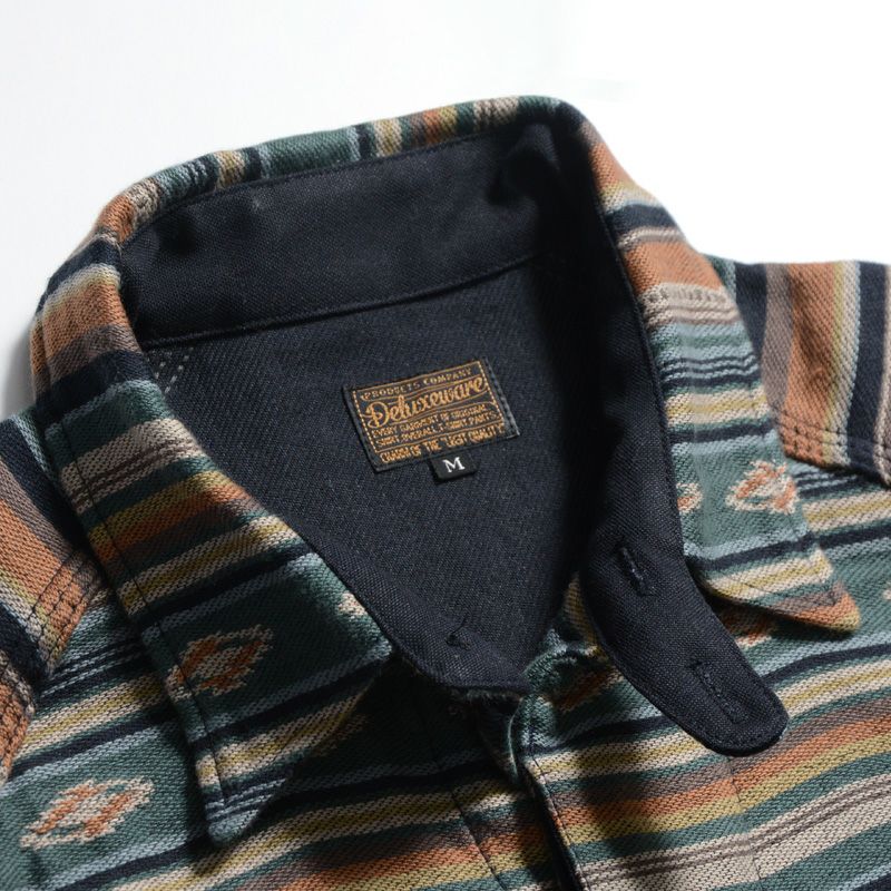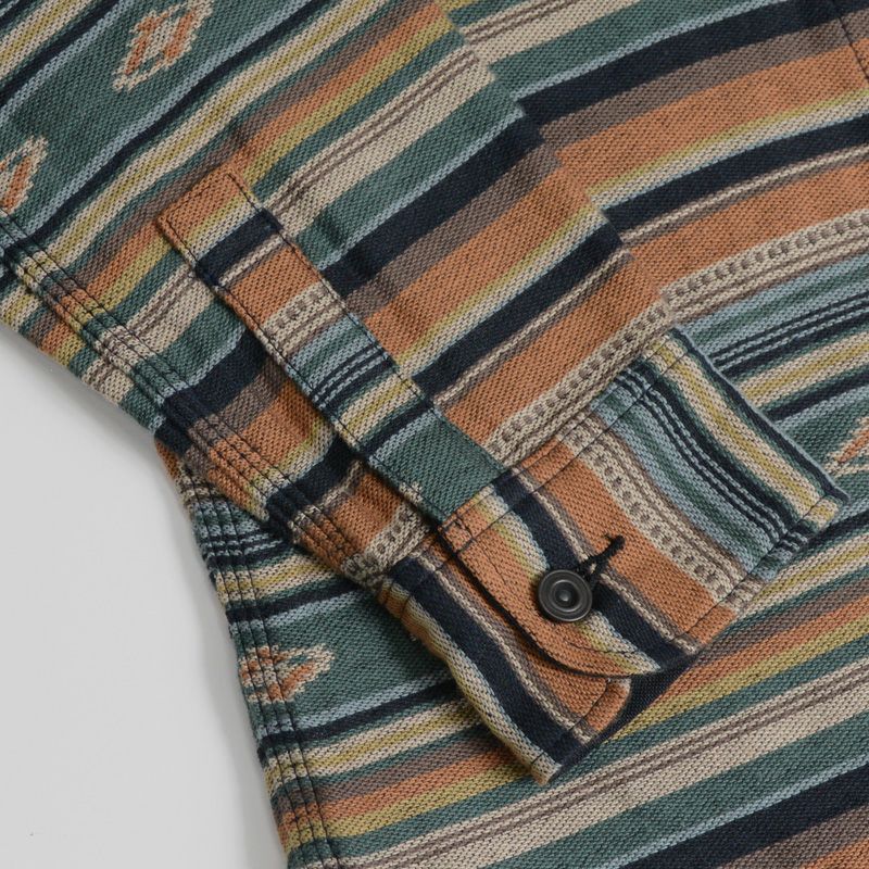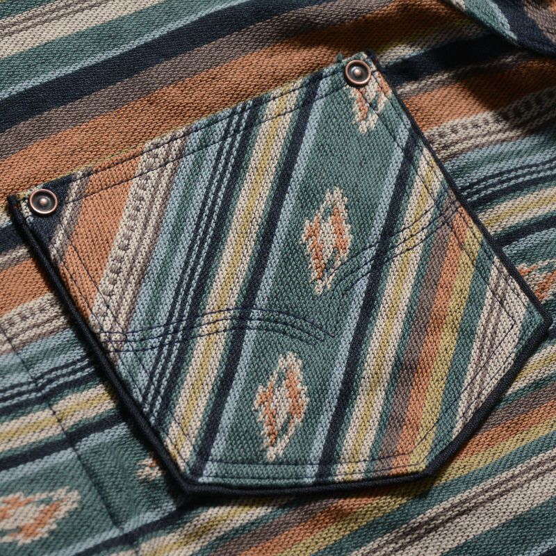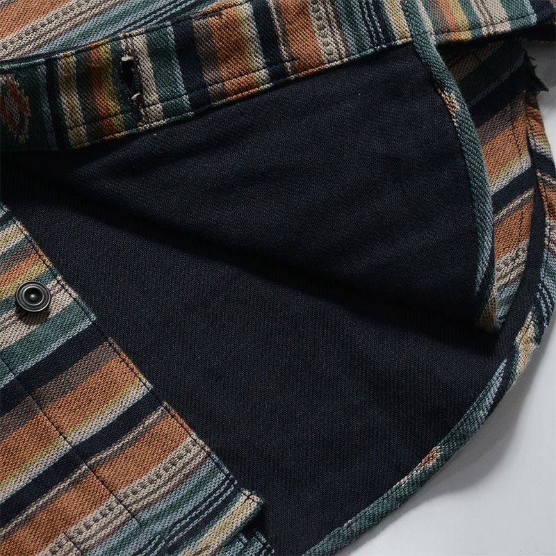 兵庫県西脇市で製造した3重織りヘビーネル素材。経糸に20/1糸、緯糸に20/2糸により構成し、ベースは2重織、ネイティブ柄部分は多色の色が重なるため3重織の組織で表現。肉厚の生地ながら柔らかな風合いが特徴。