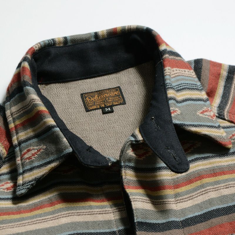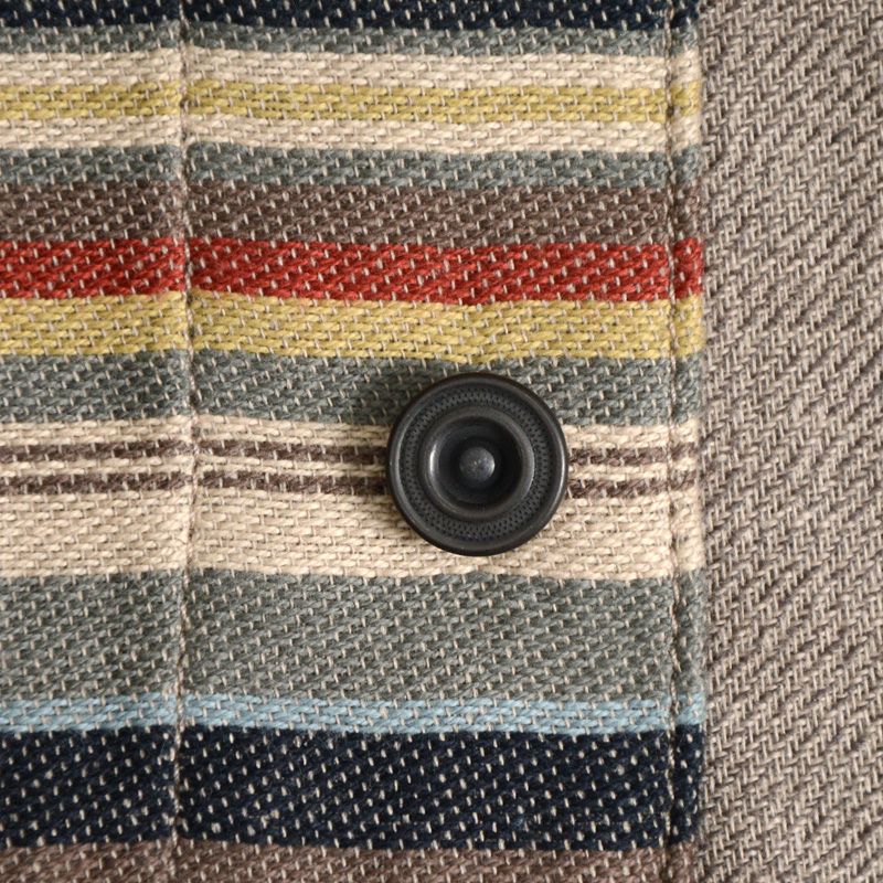 兵庫県西脇市で製造した3重織りヘビーネル素材。経糸に20/1糸、緯糸に20/2糸により構成し、ベースは2重織、ネイティブ柄部分は多色の色が重なるため3重織の組織で表現。肉厚の生地ながら柔らかな風合いが特徴。
