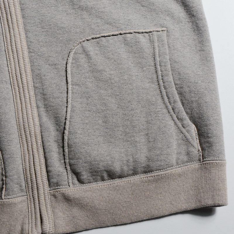 最厚ヘビーウエイトの吊裏毛で創るSPZシリーズのフルジップパーカー。長く皆様に愛されていますが、その実、製造には多くの技術を駆使していることを御存知でしょうか?このSPZシリーズは当社自社工場「オルダクト」で製造します。他のモデルと異なり、裾ラインの取り方と長い前立ての寸法が独特の型紙を使用しています。縫製する際に職人が手加減で縫い縮める分を型紙で伸ばし、ある個所を同じ運針で二度縫いするなど、緻密なモノ創りが成されています。いずれ「実はね」と語り継がれるモノ創りと商品でしょう。