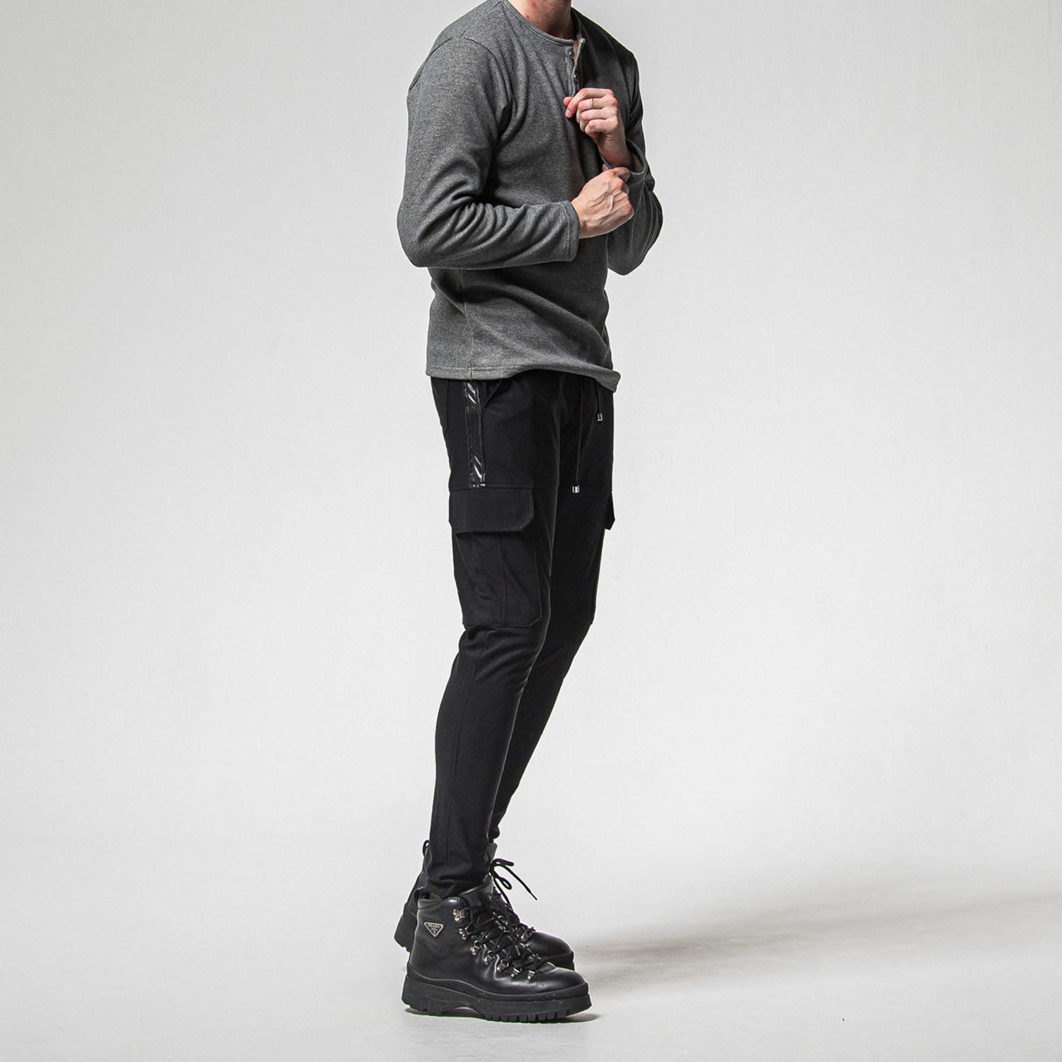 レザーラインが高級感漂う、裏起毛カーゴラインパンツ。