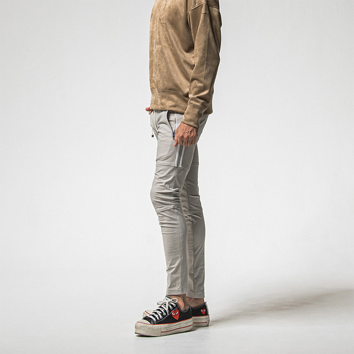 膝の切り替えと、高級感のあるエコレザーの2本ラインを膝上まで大胆に配置し、サイドポケットにはファスナーを採用。