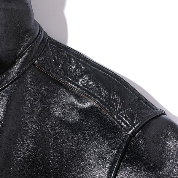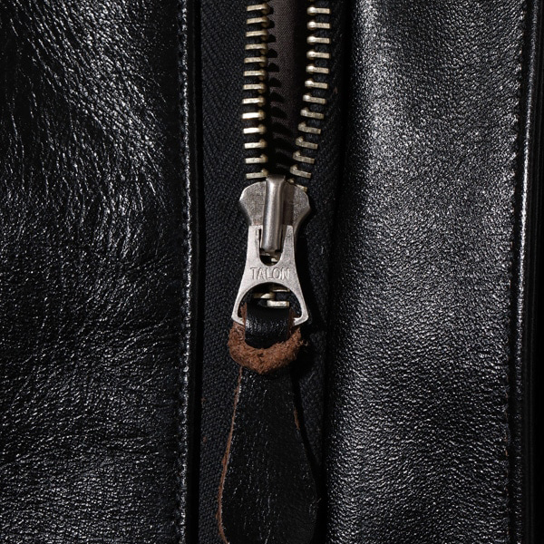コントラクターのラフウェア社をベースにしたブラックA-2。ベジタブルタンニングで熟成された馬革の芯は茶色で、黒い表面が擦れてくると味わい深い風合いとなる。