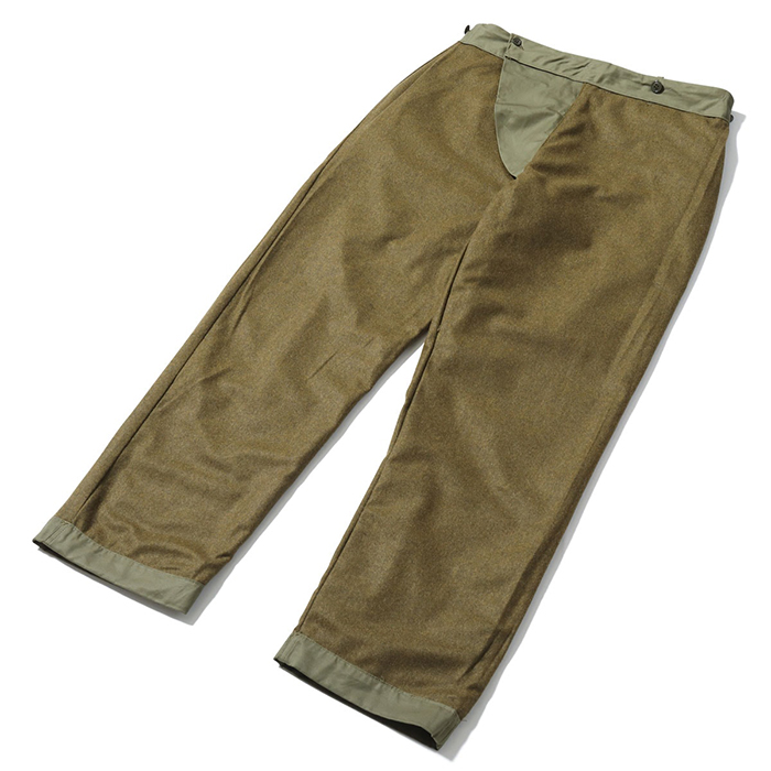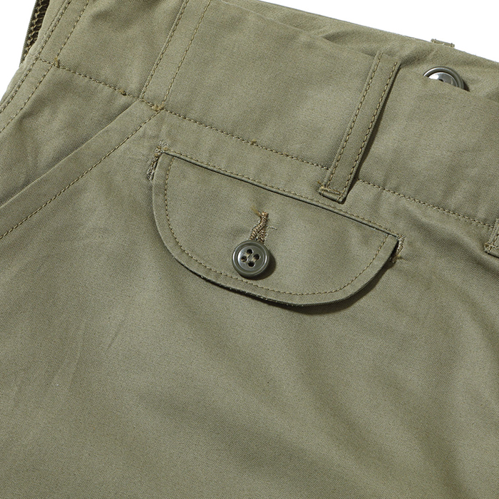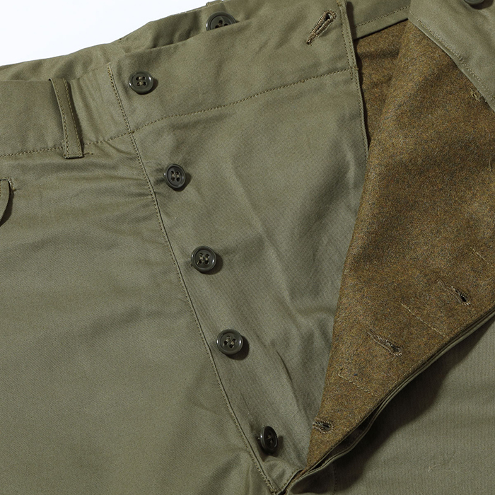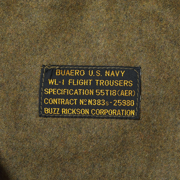 WL-1は米海軍が1940年代後半から1950年代前半かけて採用したフライトトラウザースで、ジャケットのAL-1とのセットアップで着用するフライトスーツシステム。 素材はジャケットと同じコーマ糸を用いたしなやかなコットンツイルで、ライニングにはウールフランネルを使用し、防寒性を高めている。ヒップポケットとコインポケットにはフラップが付き、中に入れたものを落とさないよう考慮された入念な設計。フロントはボタンフライ仕様で、ウエストにはベルトループとサスペンダー用のボタンが設置されている。米海軍において冬季用コットン素材のフライトスーツ、AL-1とWL-1が最後となって、次世代のナイロン製フライトスーツ、通称“WEP”へと引き継がれるのである。