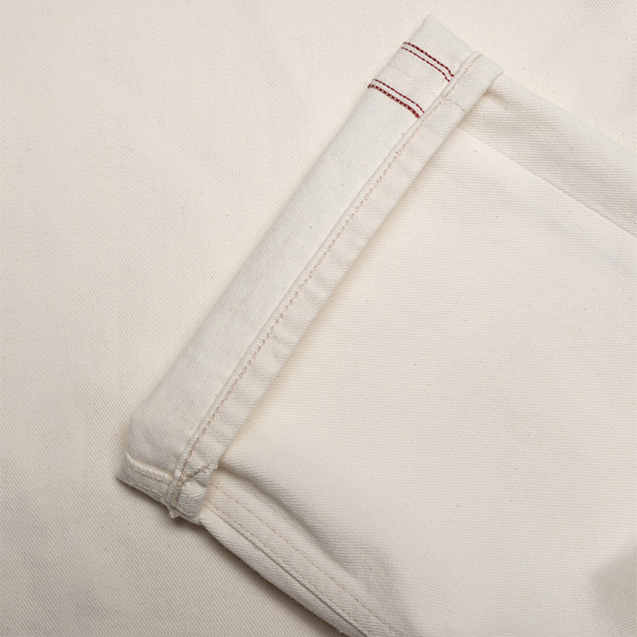 セルビッジにもこだわりが詰まっており、外側の糸は赤、中心の糸は無染色という洗練された配色で、一般的なセルビッジとはひと味違う美しさを放っています。