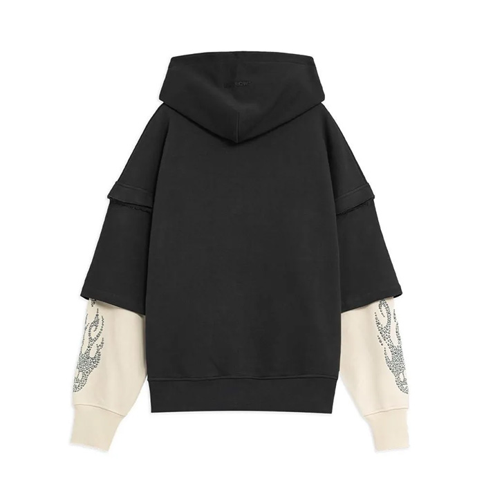 白のスウェットに黒の半袖パーカーをレイヤードしたような、ストリートライクなプルオーバーパーカーです。