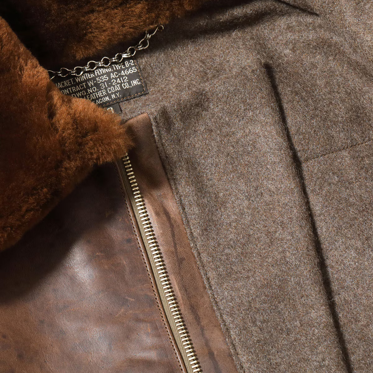 陸軍航空隊が飛行士を寒さから守るため、極寒地用フライトジャケットとして開発したのがB-2である。その採用は1932年から1934年で、採用以前はカバーオール(つなぎ)だったため、サイズで問題が生じることが多く、B-2の開発にあたって、ジャケットとトラウザ-スとに分けて構成するスタイルとなった。このことで製造過程においても重量面が軽減されたことで生産性においても格段に向上した。表に使用している革はホースハイドで、ライニングはコントラクターによってパイル状のものとブランケットのものと2種類が存在している。前身モデルのB-1ではムートンのライニングだったが、B-2では布地のライニングに変更された。襟元を閉じる方法もベルトバックルで留めるタイプと、ボタン留めのタイプと2種類存在している。また、ウエストにはカバーオール時代からの名残りで、フロントにはウエスト周りの調節が可能なベルトバックルが装備され、襟裏には襟を頭上からゴムバンドで吊り上げるためのフックを引っ掛ける金具が手縫いされている。第二次大戦以前の採用だったB-2は生産数もそれほど多くは無く、そして古い年代ということもあって当時のオリジナルと遭遇する確率は極めて低く、確認されたらその個体はミュージアムピース級の存在である。