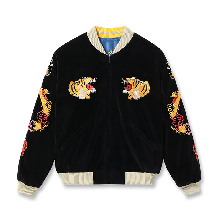 ベースとなったのは1950年代中期のヴィンテージ。川が流れる岩場で咆哮する背中の「笹虎」は日本の伝統的なモチーフだが、笹をブルー、岩場をレッドの色糸で刺繍しており、色の三原色がブラックの別珍に映える華やかな仕上がり。また本作ではJapanの文字もレッドとなっており、レアな配色の刺繍をホワイト単色のリブで引き締めている。