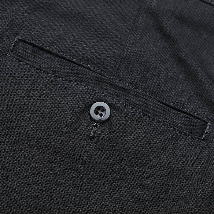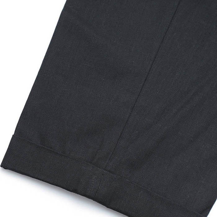 レギュラーフィット・テーパードのバランスの取れたシルエットに、ダブルヘムやヘリンボーンスレキ、ダールブラックのメタルボタンを使ったボタンフライが上質さを添える。
