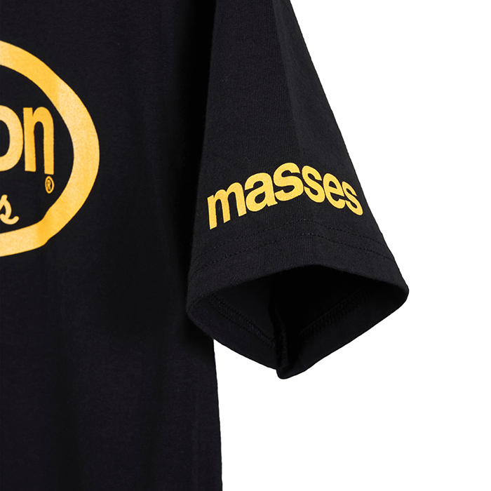 フロント、バックには90s前半頃までに見られた形状のオーバルロゴをMASSESで再現しプリントで表現、左袖にはMASSESロゴを配置したデザイン。