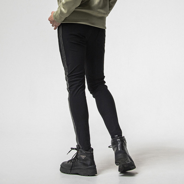 ラグジュアリーな印象に仕上げた、レザー切り替えラインのトラックパンツ。
