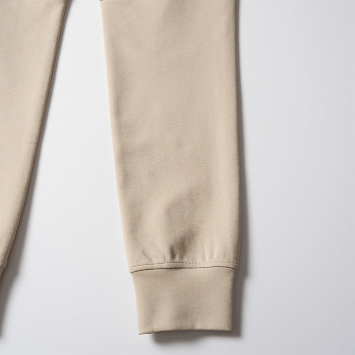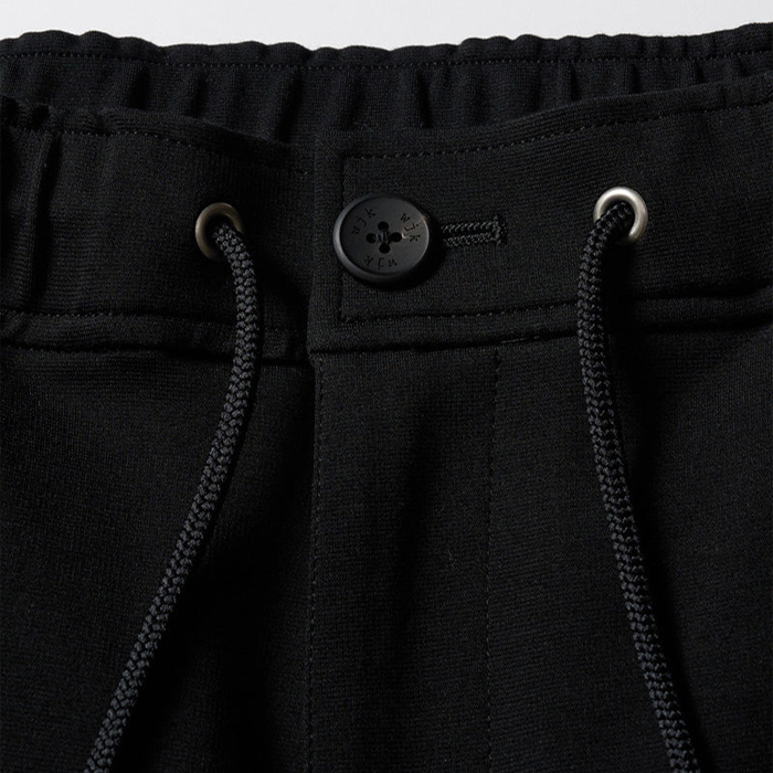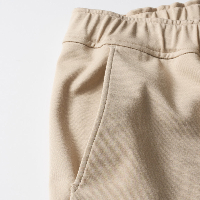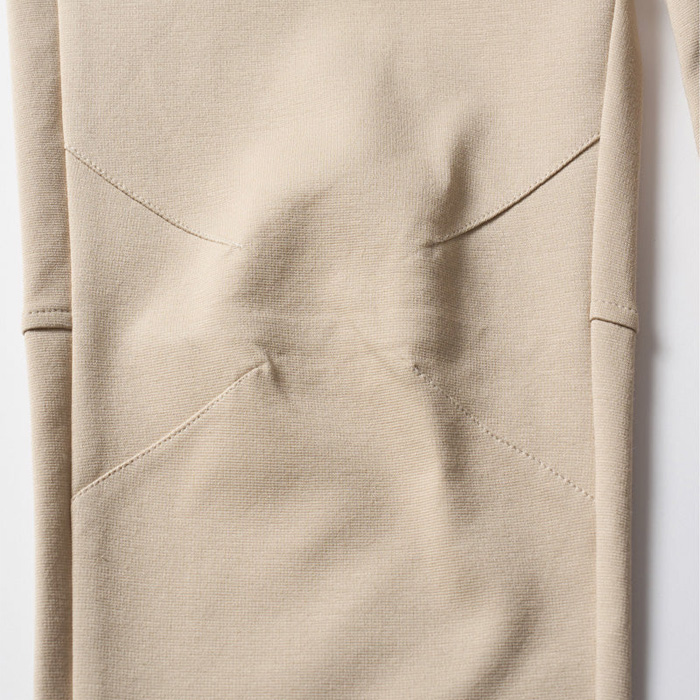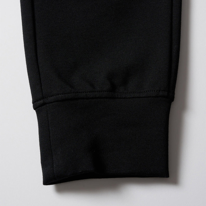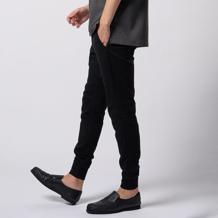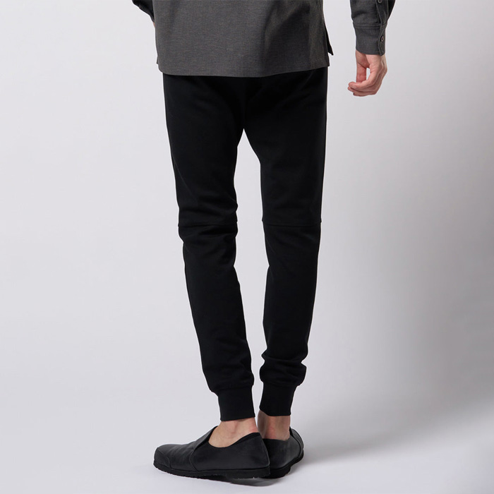膝にダーツを入れ、膝裏に切り替えを入れることで立体感を演出。股下に施したマチが可動域を広げ、細身のシルエットながらスウェットパンツ本来の動きやすさをキープ。裾リブは共地にし、ソリッドな印象に仕上げている。