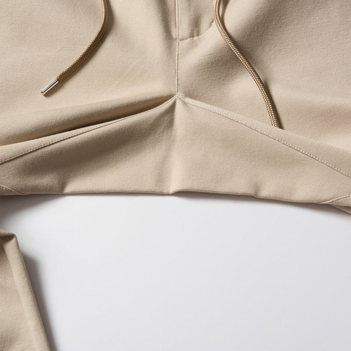 素材にはハリと膨らみの融合により生み出されたしっかりとした肉感と、キックバック性にこだわったポンチ素材を使用。上品な光沢のある生地表面、横伸びしにくいため型崩れせず、シワになりにくい。