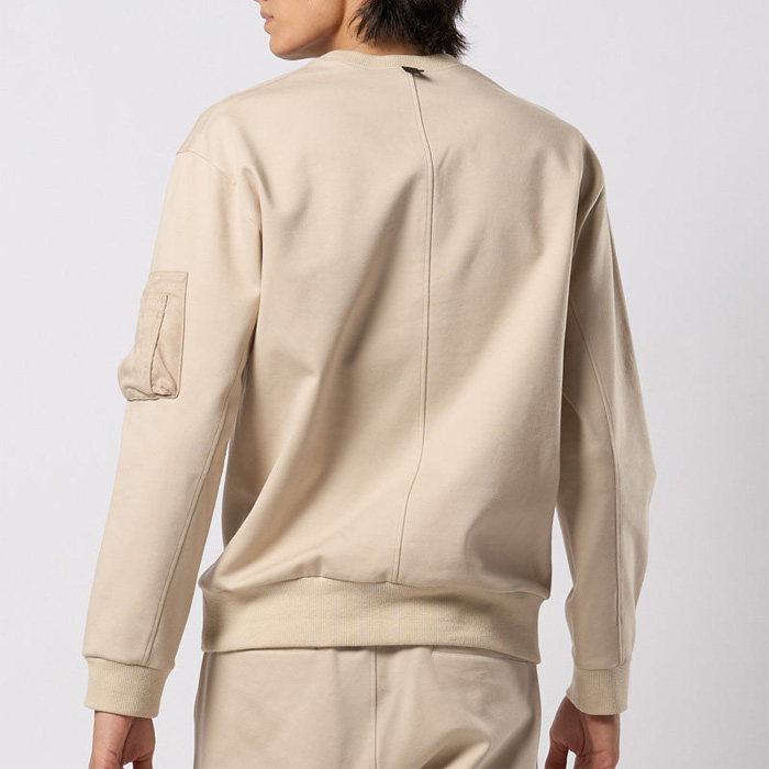 シンプルな前Vスウェットにユーティリティポケットを搭載し、ミリタリーアレンジを加えたスウェットシャツ。