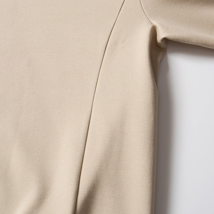 素材にはハリと膨らみの融合により生み出されたしっかりとした肉感と、キックバック性にこだわったポンチ素材を使用。上品な光沢のある生地表面、横伸びしにくいため型崩れせず、シワになりにくい。