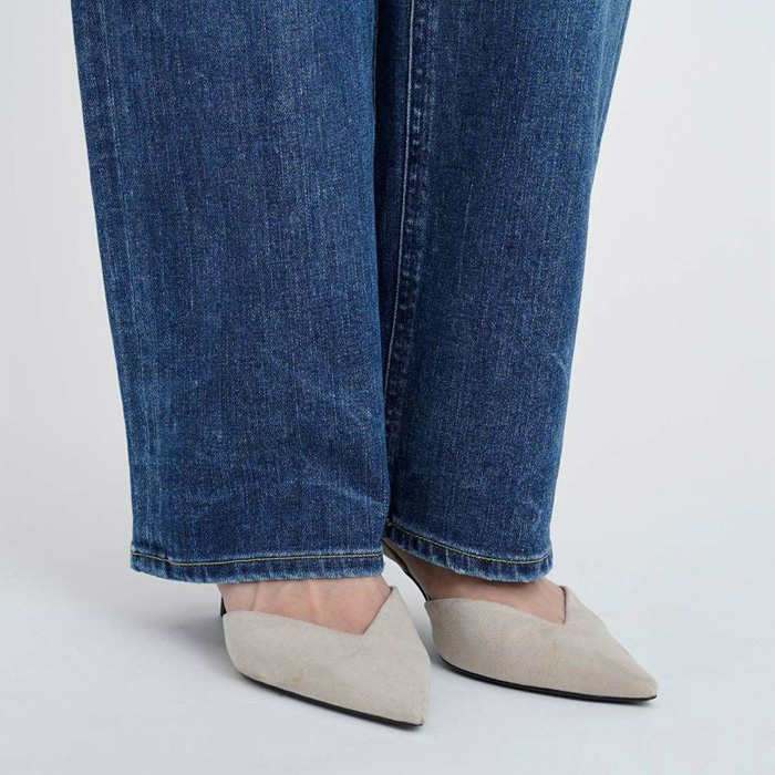 ゆとりのあるストレートはどうしても野暮ったくなりがちですが、LEAはパターンにこだわることで美脚に、