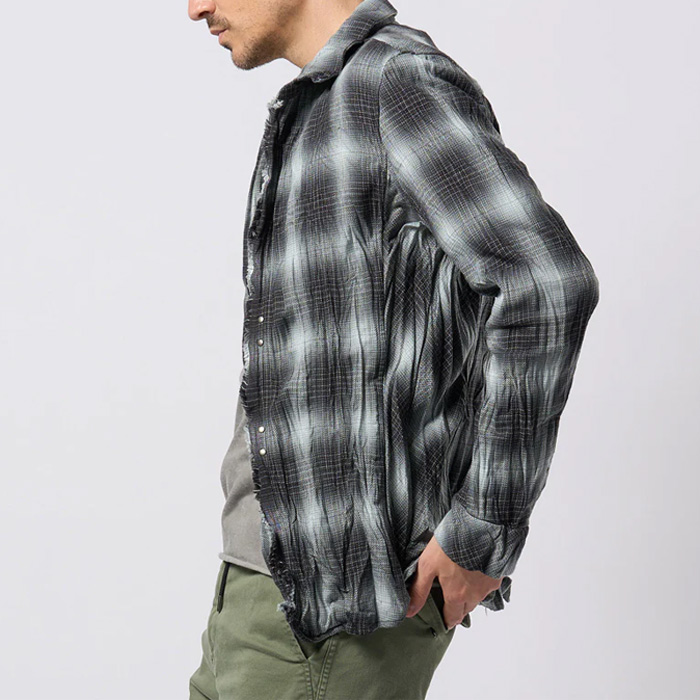 タテヨコ10/1で織りあげた中肉厚のオンブレーチェック素材を採用。インディゴ染料を使用しており、着用~洗いを繰り返すことでデニムの様な経年変化が楽しめる。