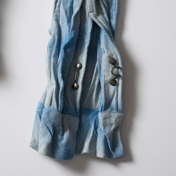 全体にシワ加工を施すことで、着用の際ウエストに絶妙なフィット感を生みだす。また、センターに設けられた2つのフックを留めることで、肩幅を強調した男らしいシルエット形成が可能。