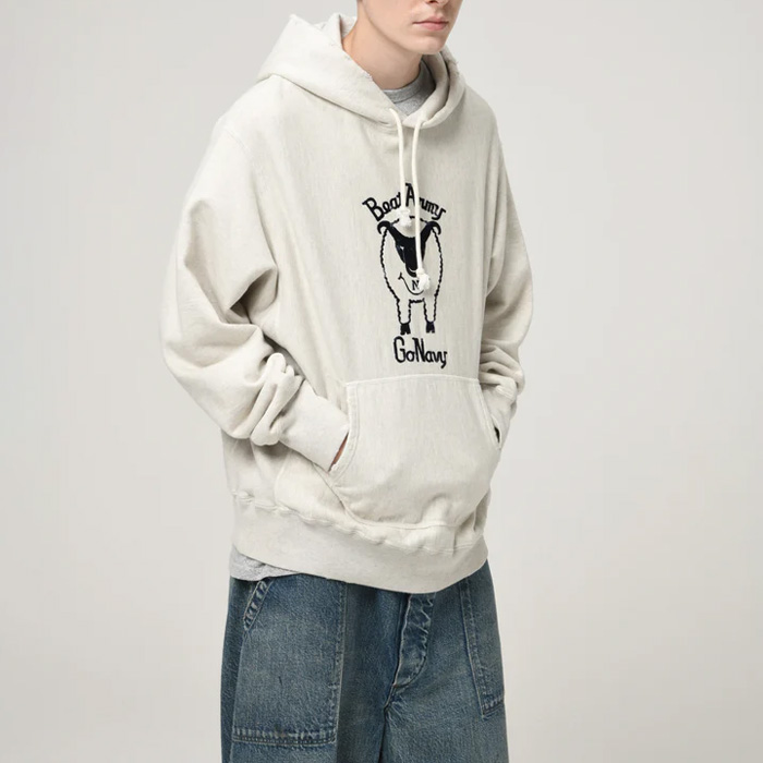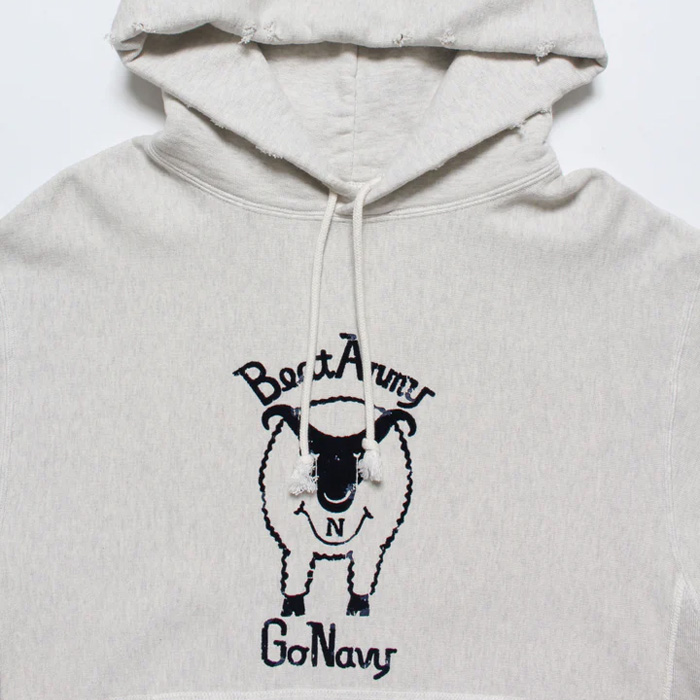 ヴィンテージTシャツに見られる羊モチーフのフロッキープリントデザインを下敷きに、「BEAT ARMY」のフットボールカルチャーを掛け合わせたグラフィックをフーディに展開。US NAVYモチーフのGOATへ置き換えることで、ミリタリーとアメリカンユーモアが交差するパロディ表現に仕上げている。