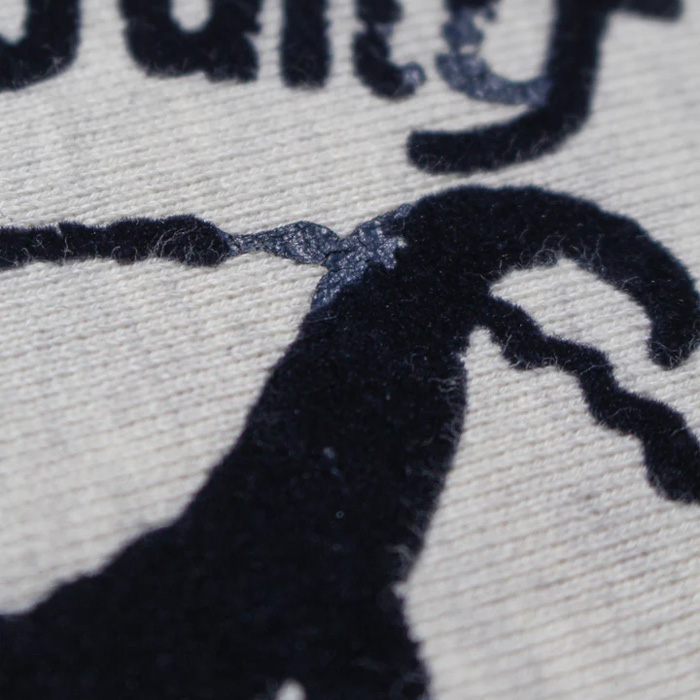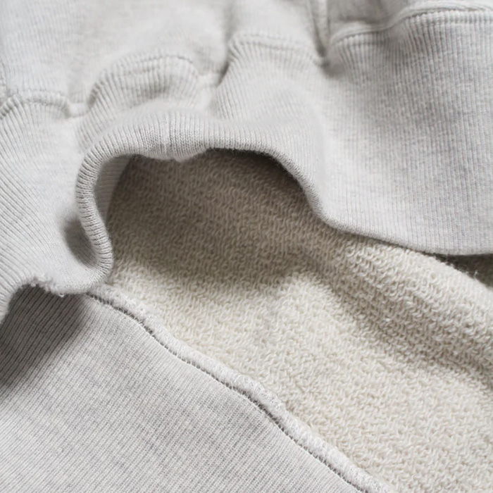 ビンテージクルースウェットの設計思想を踏まえたシルエットと縫製仕様に、起毛無しの厚地裏毛を組み合わせ、ラフさと重みのある着用感を両立。フロッキープリントの表情が自然に馴染むバランスに仕上げている。