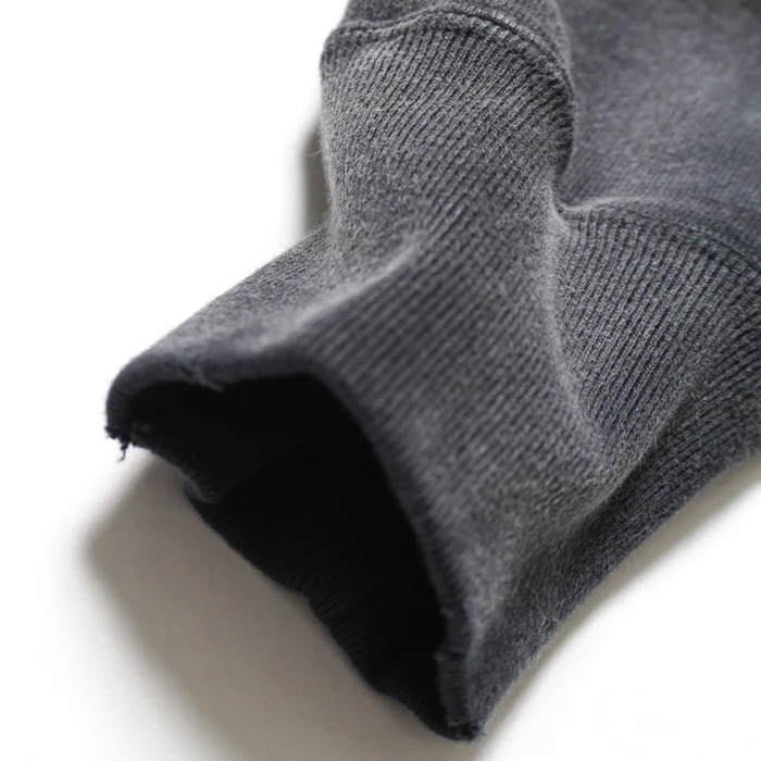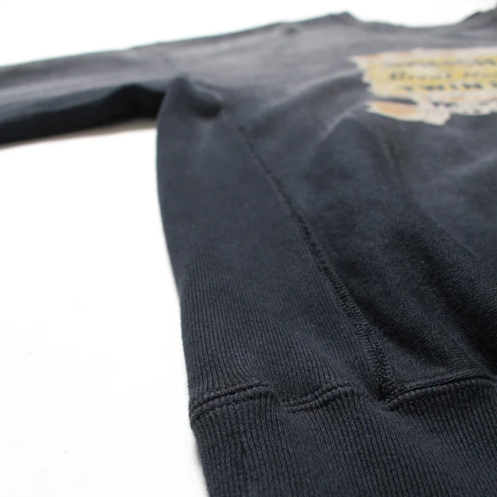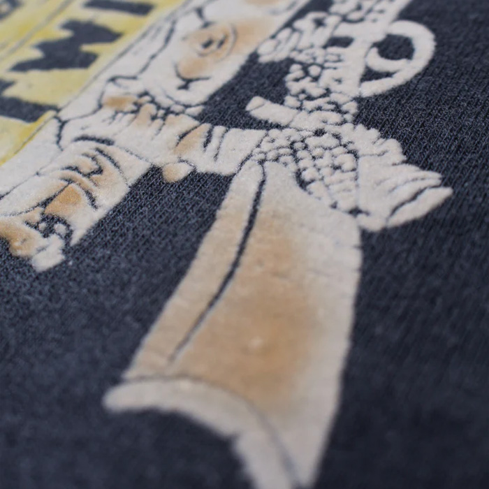 1960年代に見られる植毛フロッキープリントを再現し、当時らしい素朴さと少し野暮ったいムードを残した仕上がりに。 ボディには古いスウェットの設計思想を踏まえた裏毛を使用し、ラフさの中に芯のある佇まいを持たせている。