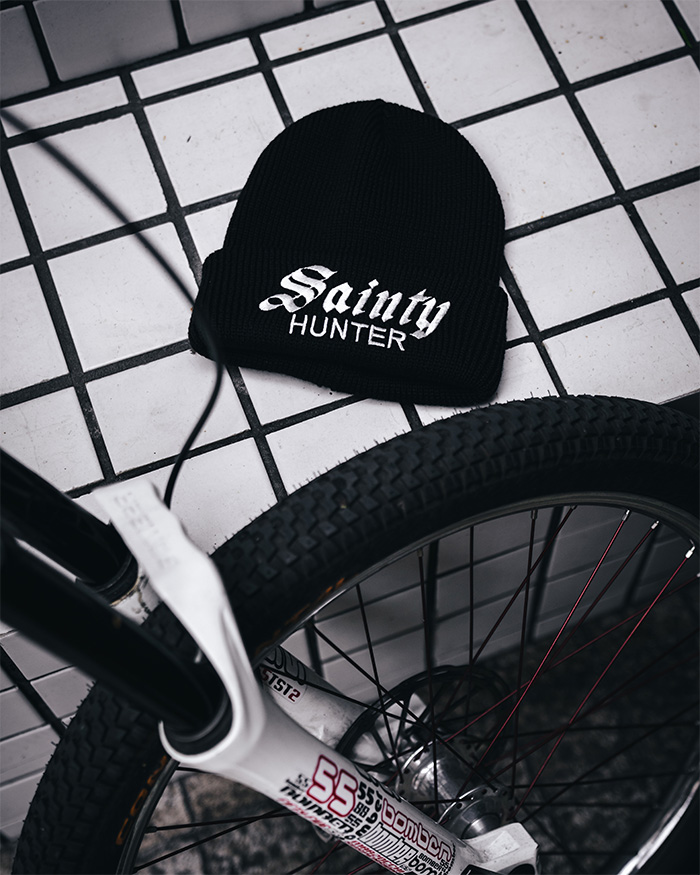 秋冬のスタイリングに欠かせない、ブラックのニットキャップ。フロントには「Sainty HUNTER」の刺繍ロゴを配置し、無地では出せない存在感をさりげなくプラスしています。