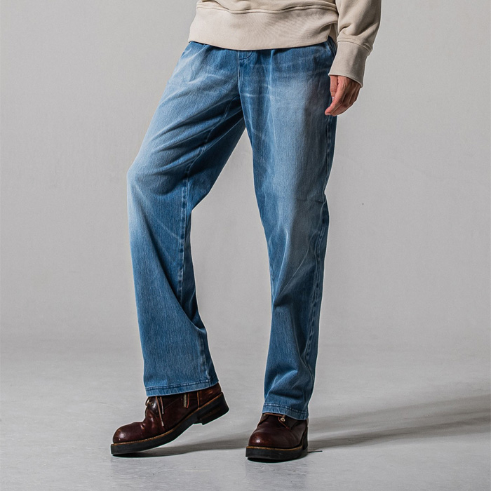 ライトオンスのジャージデニムを使用した、スラックス型セミワイドシルエットのワンタックイージーパンツ。