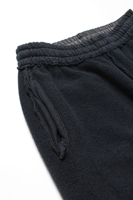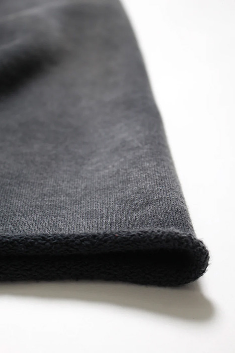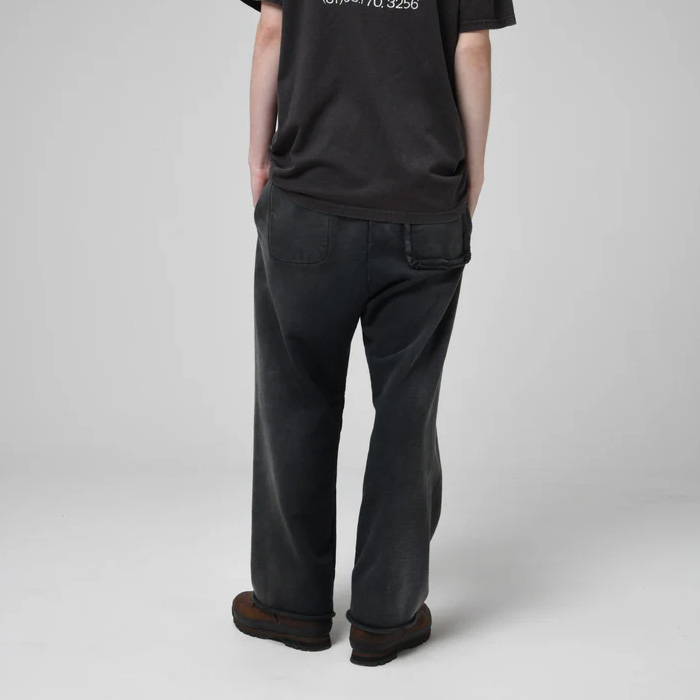 股上を深く取ったスラックスライクなシルエットと、切りっ放しの裾が古いスウェットの空気感を残している。
