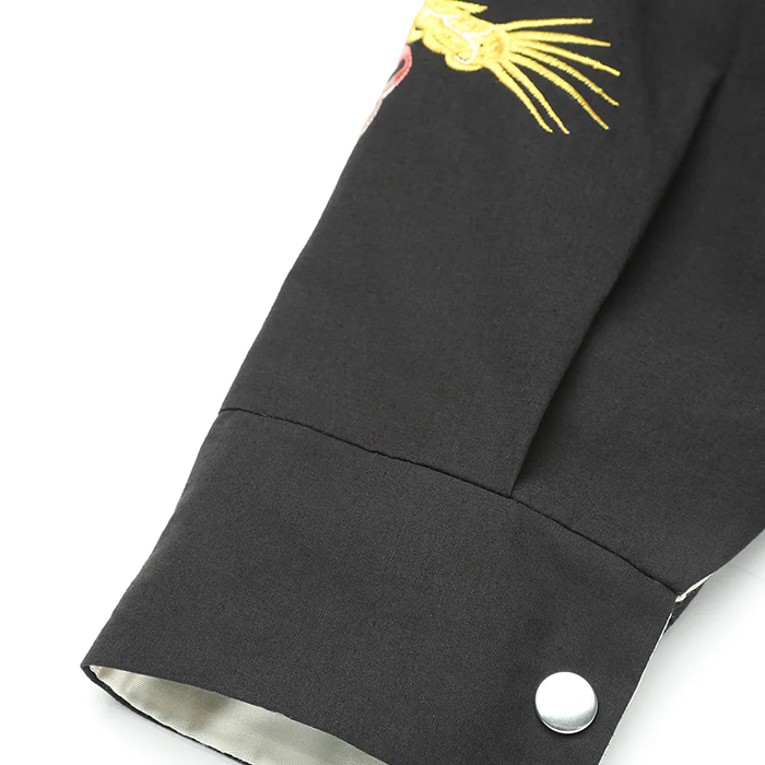 手振りミシンによる職人技が光る、迫力ある刺繍のスーベニアジャケット。 繊細なグラデーションと重層的なステッチワークがモチーフに奥行きを与える。 ボディには軽やかなムラ感のコットンファブリック、ライニングには光沢のあるレーヨンサテンを使用。 身幅が広くショート丈のクラシックなボックスシルエットで、ヴィンテージの雰囲気を表現。 ストレートスライダーのUNIVERSALジッパーとハンマー加工のドットボタンでクラシカルな仕上がりに。