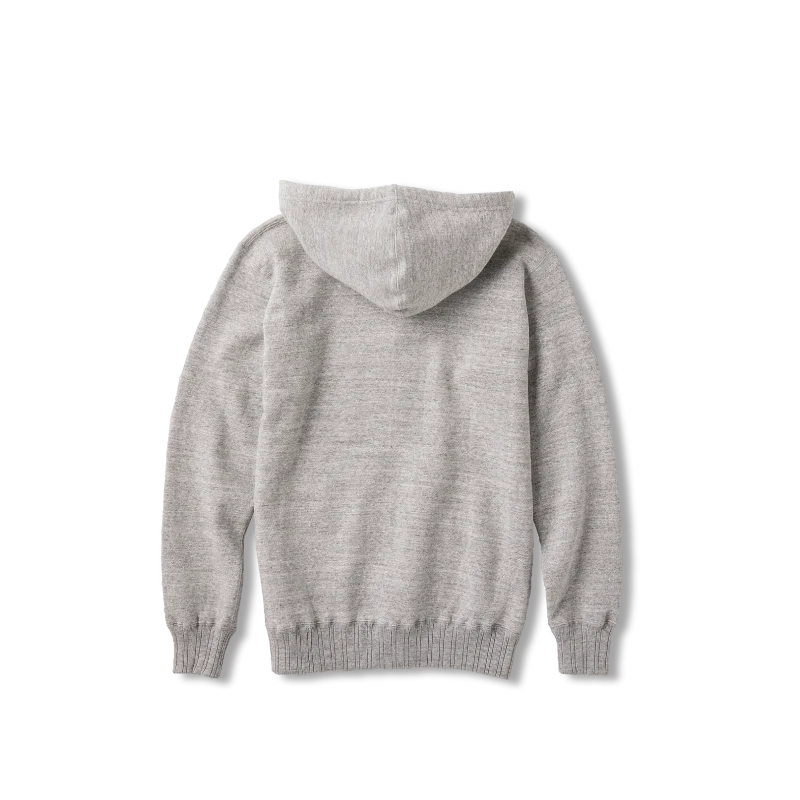 クルーネックのネック周りに後からつけられたフード ” 後付けパーカ“と呼ばれるアイテムです。ジンバブエコットンの原綿(茶綿)を先染めした贅沢な吊り裏毛を使用することで、原綿の肌触りを直で楽しむことが出来ます。盛り上がった2本針の縫製を現代では”かまぼこ”とよばれ、良くない縫いとされていますが、あえてかまぼこにすることで40年代の表情が再現されます。
