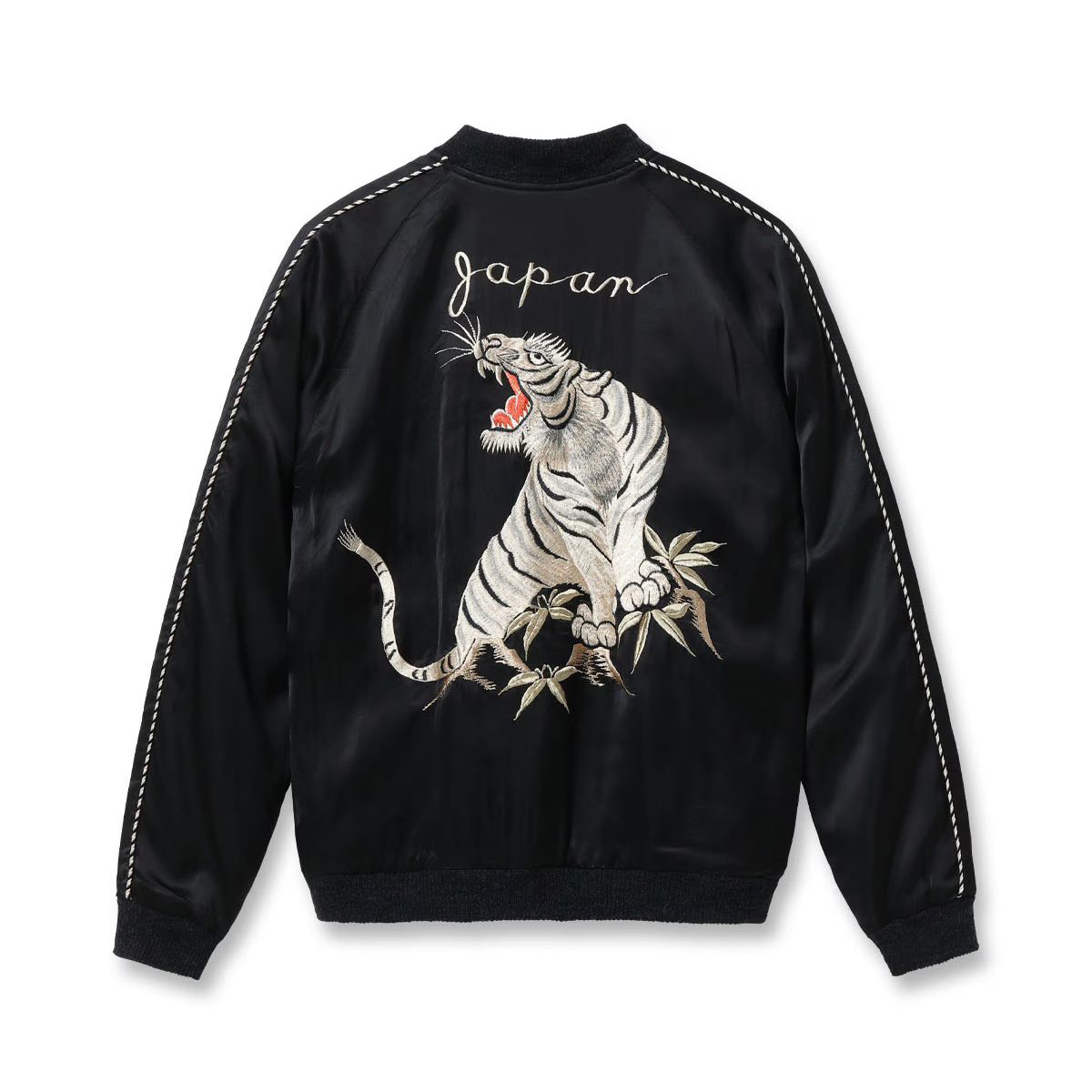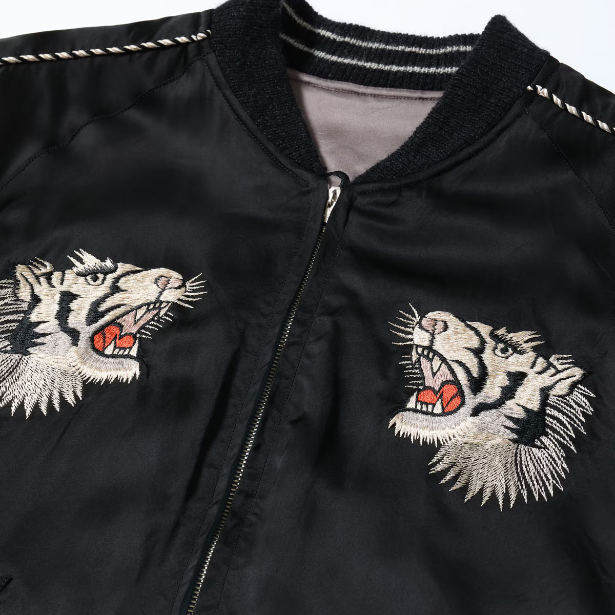 こちらはテーラー東洋独自のアレンジを加えたモデルで、表面は黒一色のボディに白虎が咆哮する絵柄。元にしたヴィンテージはカラフルな配色であったが、本作はモノトーンに仕上げた。刺繍は白の色糸を基調としつつ、箇所により針足の方向を変えて筋骨隆々とした虎の体躯を表現。さらに部分的にグレーや黒を差して立体感を強調している。下部の笹の葉や岩肌は一見すると虎と同色に見えるが、実はそれぞれ色味を変えており、計7種類の色糸を使い分けた贅沢な刺繍が特徴。