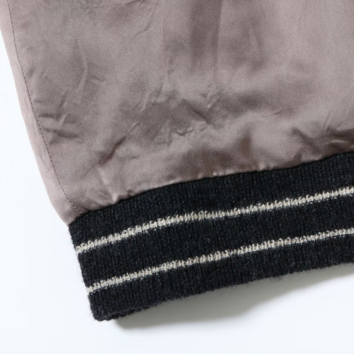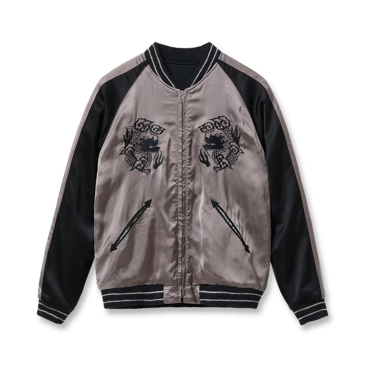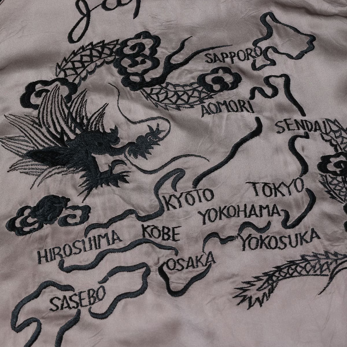 対してリバーシブル面はジャパンマップ柄。褪色したヴィンテージの魅力的な色味から着想を得たパープルグレーのボディに、黒一色で日本地図と龍を刺繍している。ヴィンテージは多色であったが横振り刺繍の立体感により単色でも絵柄の迫力が損なわれることはなく、身頃のグレーより袖下のブラックの方が濃い「逆配色」のボディに載せることで上品に。1940年代当時も同じ刺繍型で配色違いのスカジャンは作られており、ヴィンテージの刺繍の魅力とオリジナルの配色の魅力を兼ね備えたスペシャルな一着に仕上がっている。