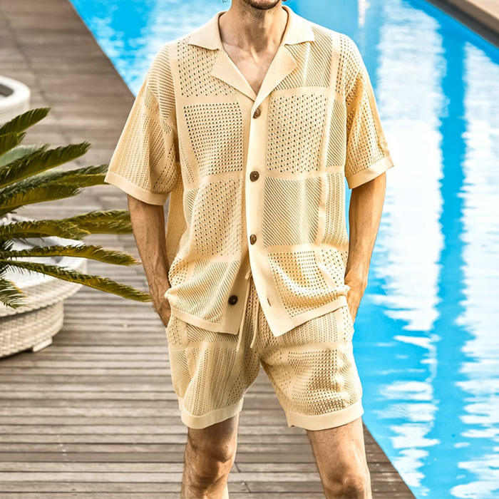 柄違いの透かし編みをブロックに配したハーフパンツ。