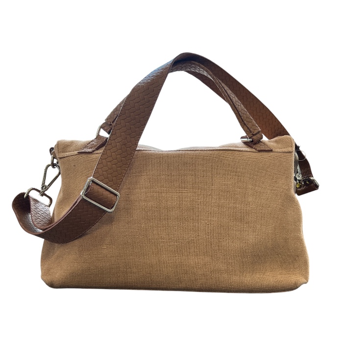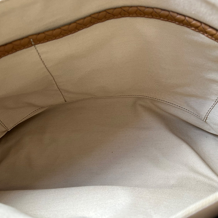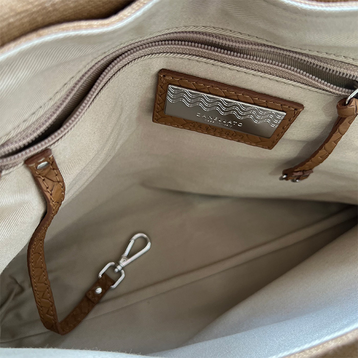 このポスティーナには、コットンキャンバスが使われていて、持ち手の部分にはイントレチャート風に型押しされたレザーが採用されています。
