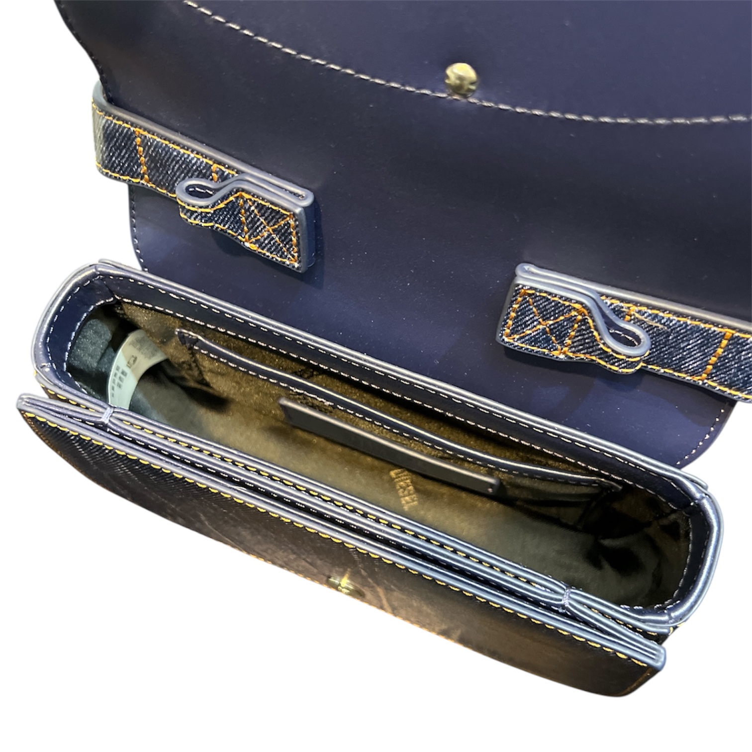内側にはオープンポケットと3つの仕切りを備え、携帯電話や二つ折り財布などの必需品がすっきり収納可能。