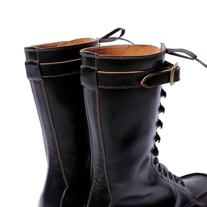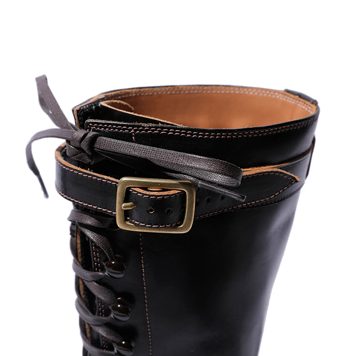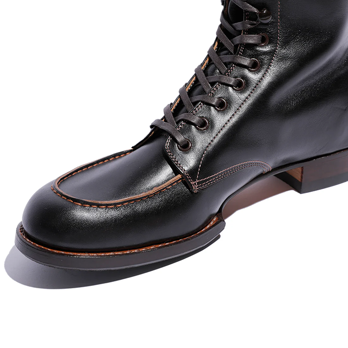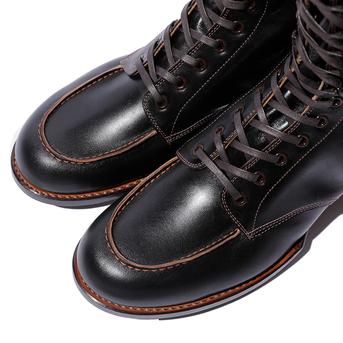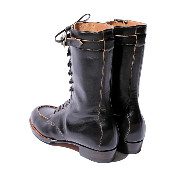 この丈の高い「ブーツ」は、屋外での危険を伴う仕事や、アウトドア活動などで広く履かれていました。Grand Sportif (グラン・スポルティフ) は、そうしたふくらはぎ丈(中底から履き口まで US 8 サイズで 25cm となり、約10 インチ丈)のモカシン型のブーツです。ラスト、丈以外のデザイン、製法、ソールなどは 定番 Sportif と同様ですが、アッパーの革は Sportif とは違って、イタリア産の馬革(ホースフロント)の下地を日本で黒染め加工して茶芯としたものを使っています。