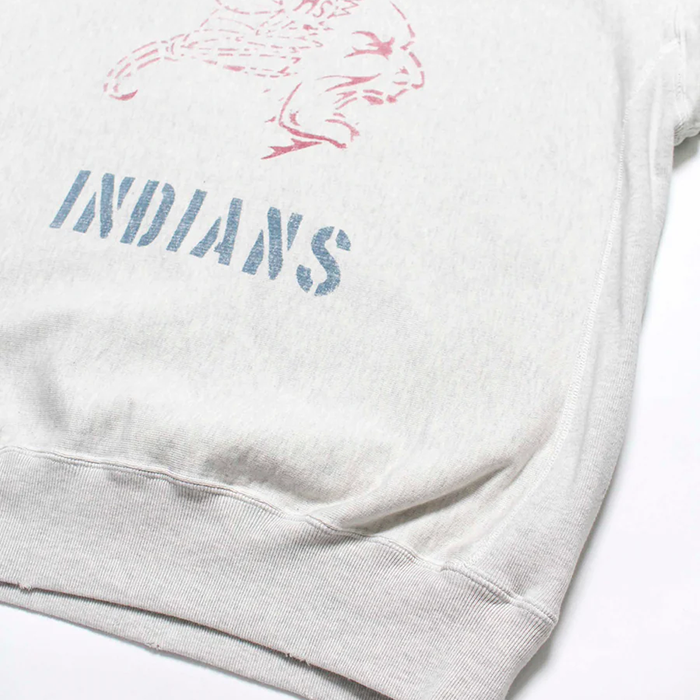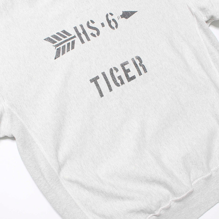 米海軍ヘリ部隊HS-6の通称“SCREAMIN INDIANS”が部内で自作したステンシルウェアをイメージした一枚。任務を終え兵舎で袖を通す“静かな夜のためのスウェット”をコンセプトに、加工はあえて控えめに設定。 オールドを感じるシルエットに、ミシンの改造により実現した生地の重なり具合まで拘ったフラットシーマ縫製や独自の縫製仕様、肉厚なオリジナルスウェット生地を採用。見えない部分にまで拘りを詰め込んだスウェットシャツ。