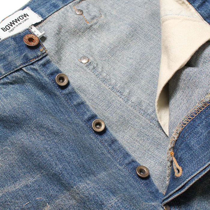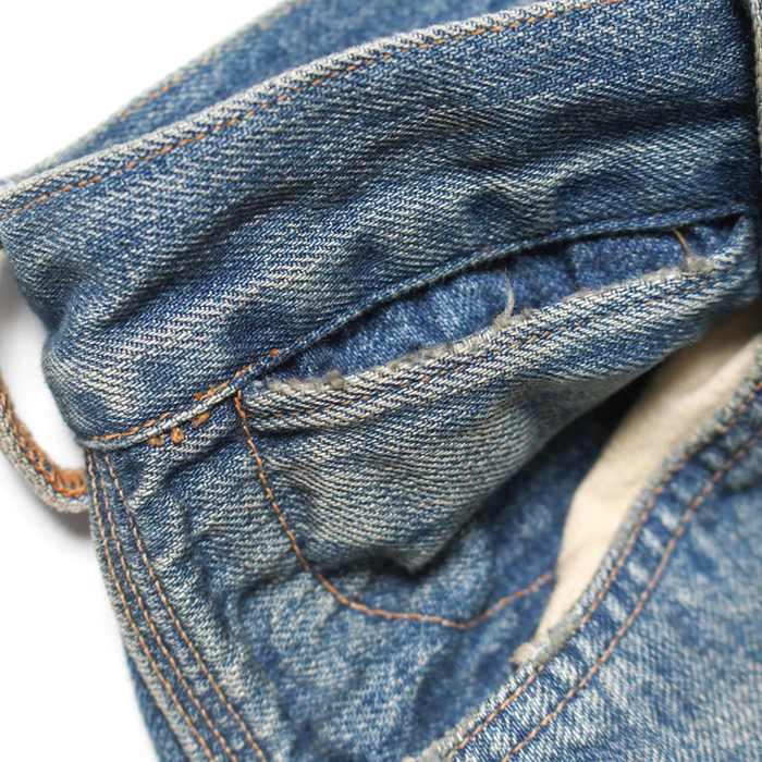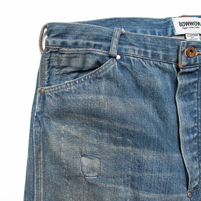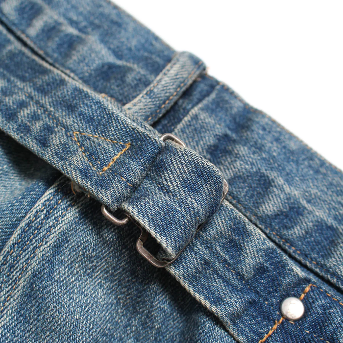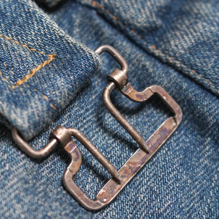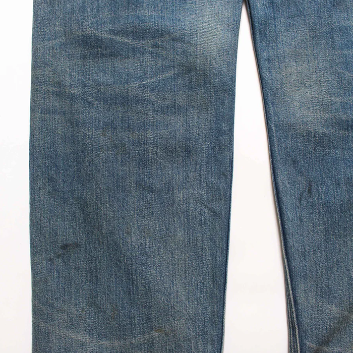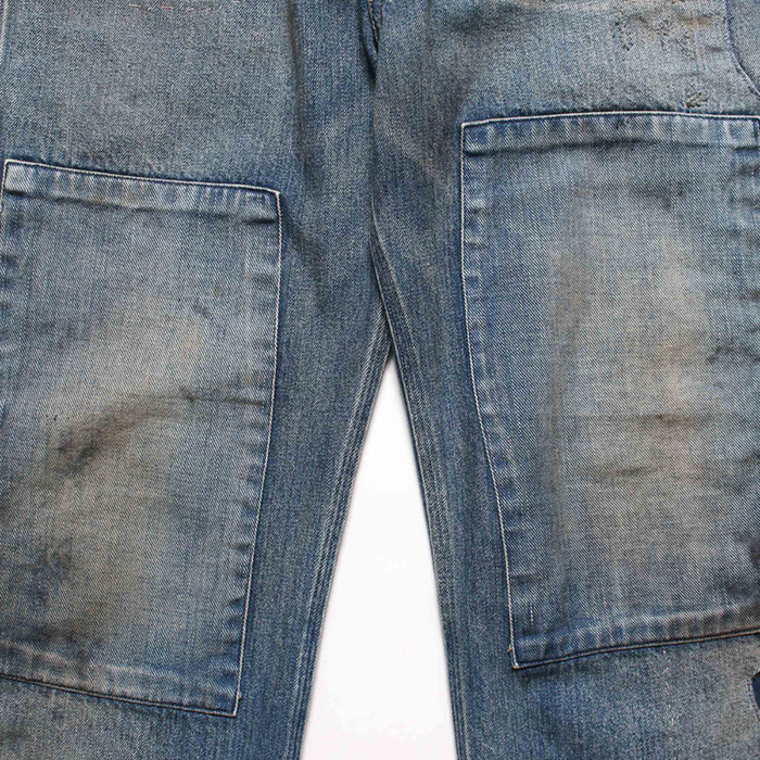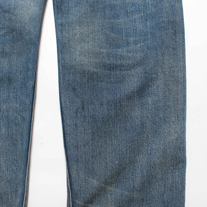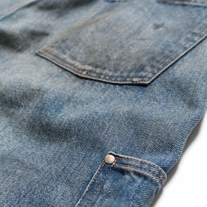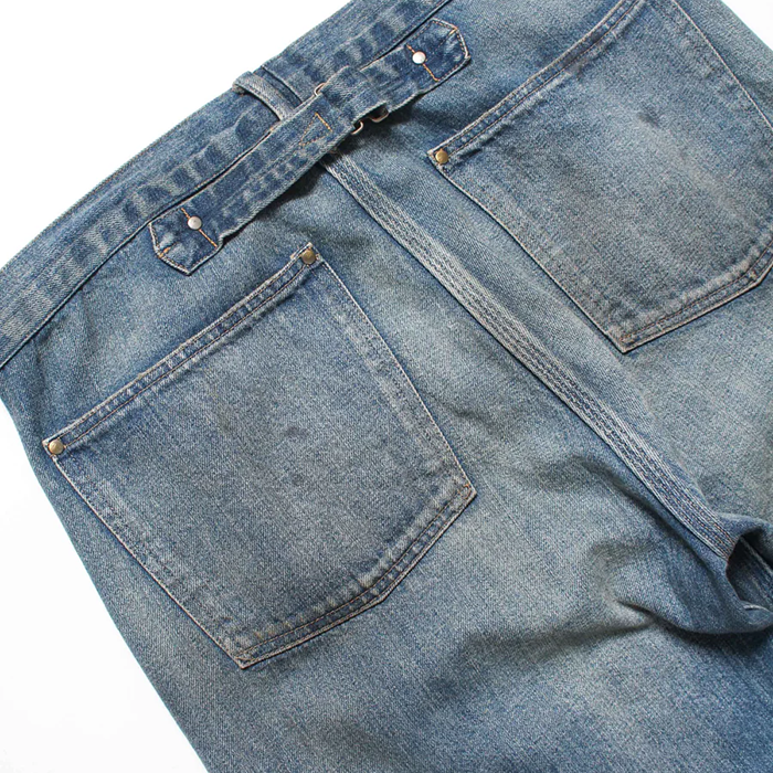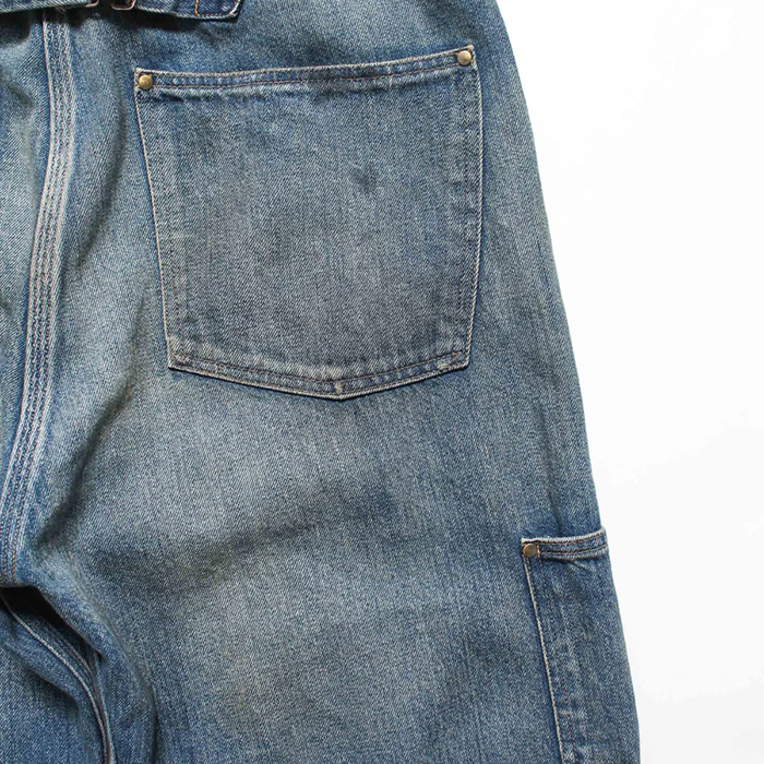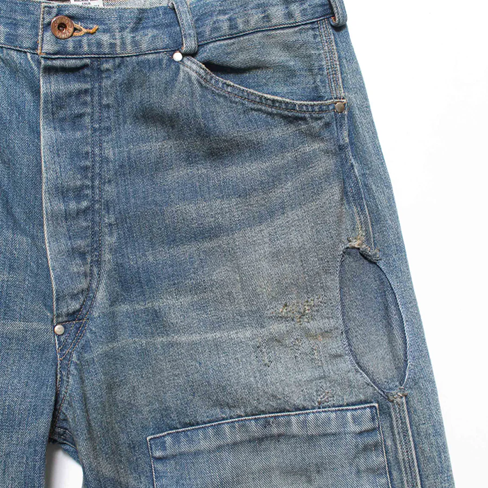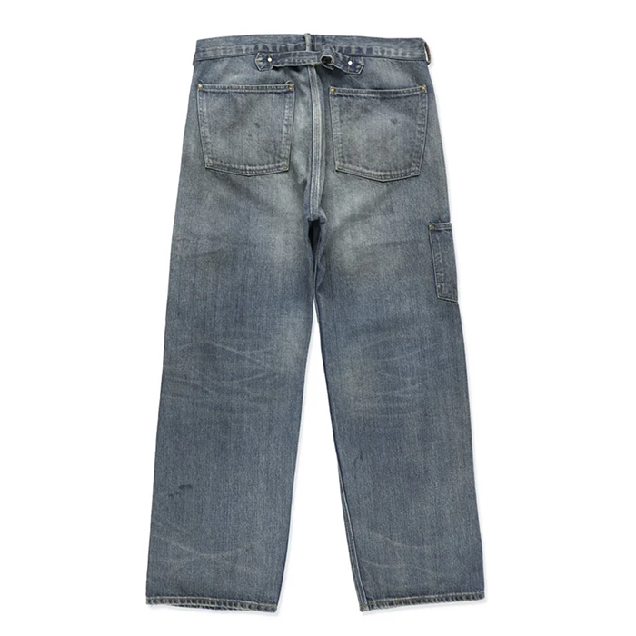 20世紀初頭、1920年代以前の鉱山では、坑道を照らす光源といえば蝋燭だった時代。 そのキャンドルを安全かつ携行しやすくするために備えられた、細長い専用ポケットであるキャンドルポケットは、当時の鉱夫の命を支える重要なディテールだった。 本作は、1920年代以前に実在した鉱夫用デニムパンツをベースに製作。 無骨なデニム、補強リベット、ステッチに加え、ウエストのフィット感を調整できるシンチバックを装備。 過酷な作業環境を耐え抜くための仕様を忠実に再現している。 履きこまれた色落ちやアタリ、リペアの数々は、まるで坑道を歩んだ鉱夫たちの足跡を刻むように製作。 当時の空気感を色濃く纏う当時に近いフィッティングを再現しつつ、今のファッショに使えるシルエット。