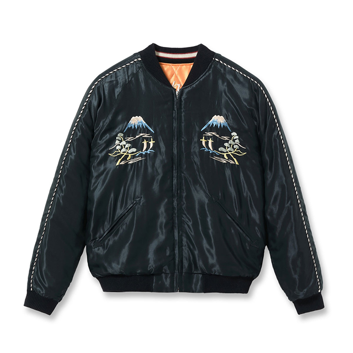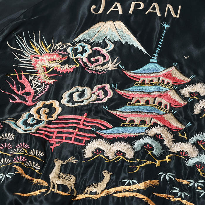 リバーシブル面は、黒一色のボディにブルーやピンクなどカラフルな淡い色糸で日本の風景を描いたランドスケープ柄。モチーフは冬の風景で、胸には富士山と松、背中には龍やオリエンタルな仏塔、松の木の根元に佇む鹿を刺繍。当時の米兵にとって、スカジャンは祖国に持ち帰りたくなる魅力的な風景画でもあった。