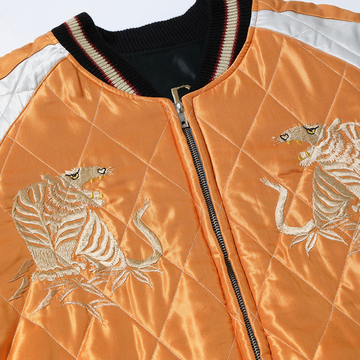 両面にアセテートを使ったスーベニアジャケットには、このような中綿入りでキルティング仕様のタイプも存在する。中綿なしのタイプ同様にスカジャンの歴史の黎明期から作られており、キルティングステッチは片面にしか入っていないためリバーシブルで2種類の表情を楽しめる。
