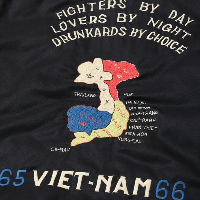 戦後の日本で誕生したスカジャン同様、1960年代から1970年代のベトナム戦争時に生まれたスーベニアジャケットが、通称ベトジャン。コットンツイル、もしくはカモフラージュ柄のポンチョライナーの2種類の生地が主に使われ、マットな太めの色糸で絵柄が刺繍されている。