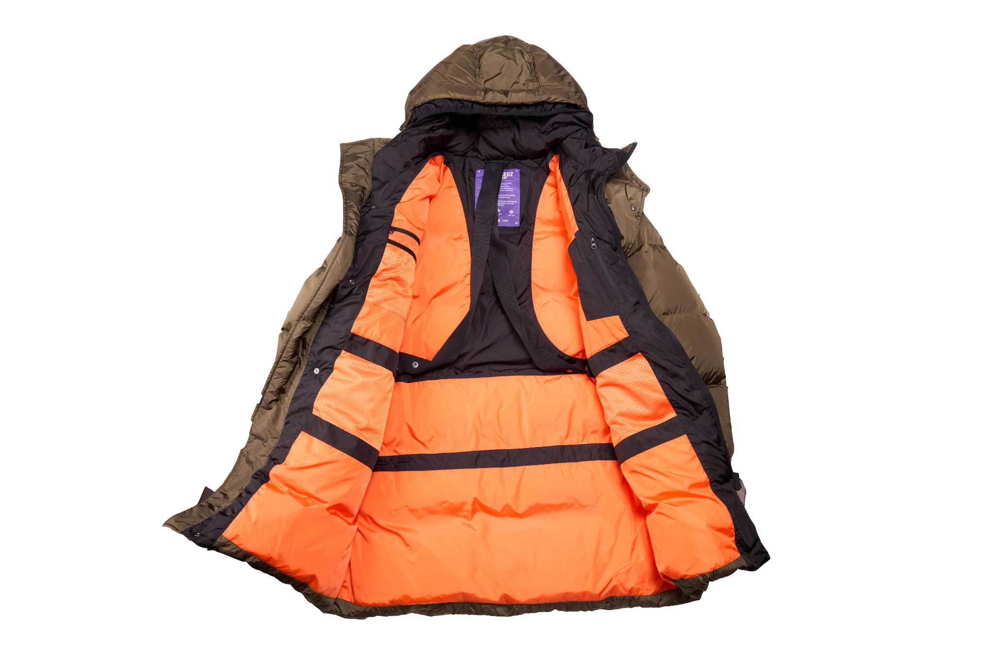 フードにはトグル付きドローストリングを配し、風の侵入を防ぐスナップボタン付きストームフラップを備えた実用的な設計。