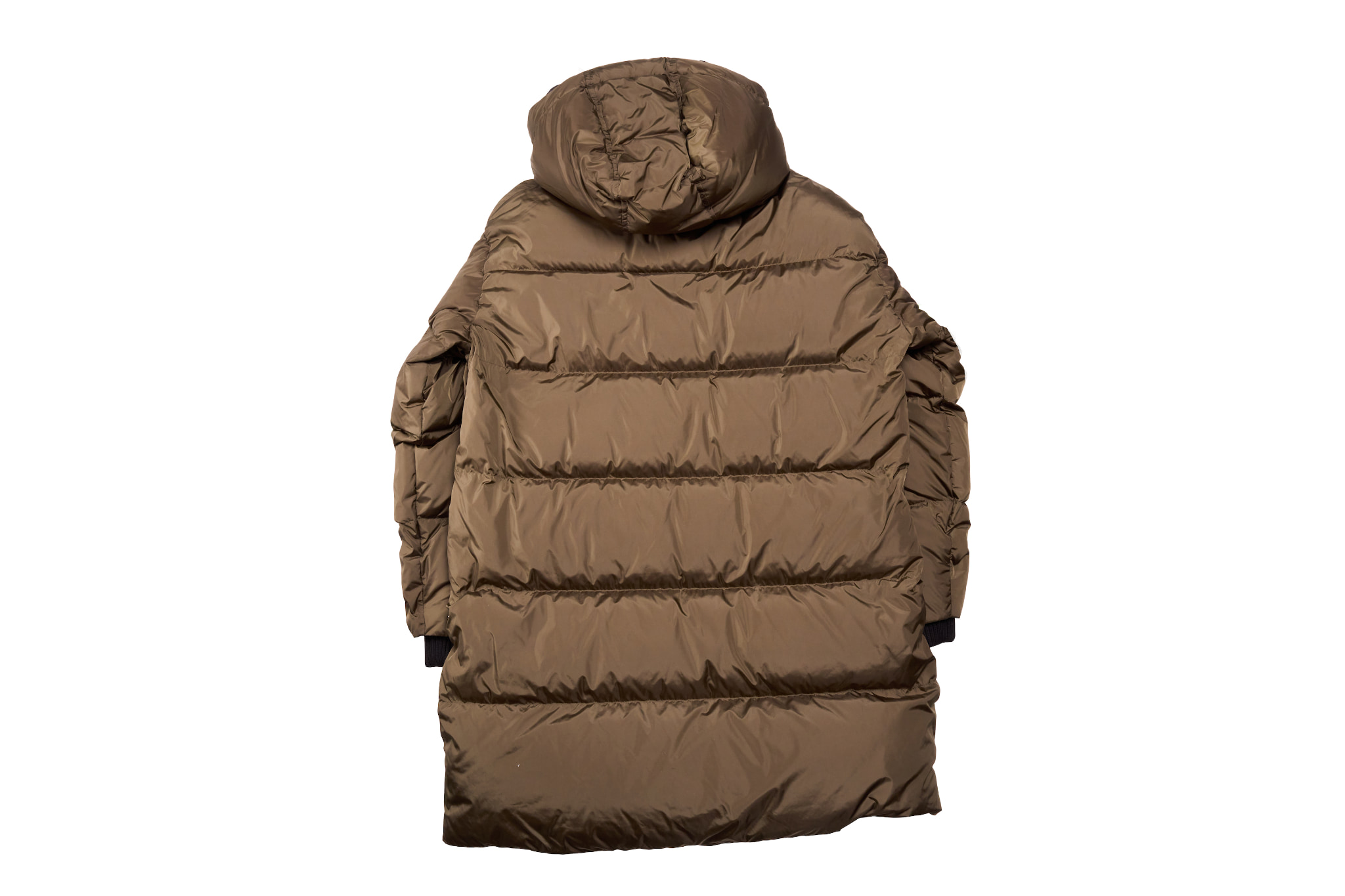 光沢感のあるシャイニーナイロンを使用したダウンコート。